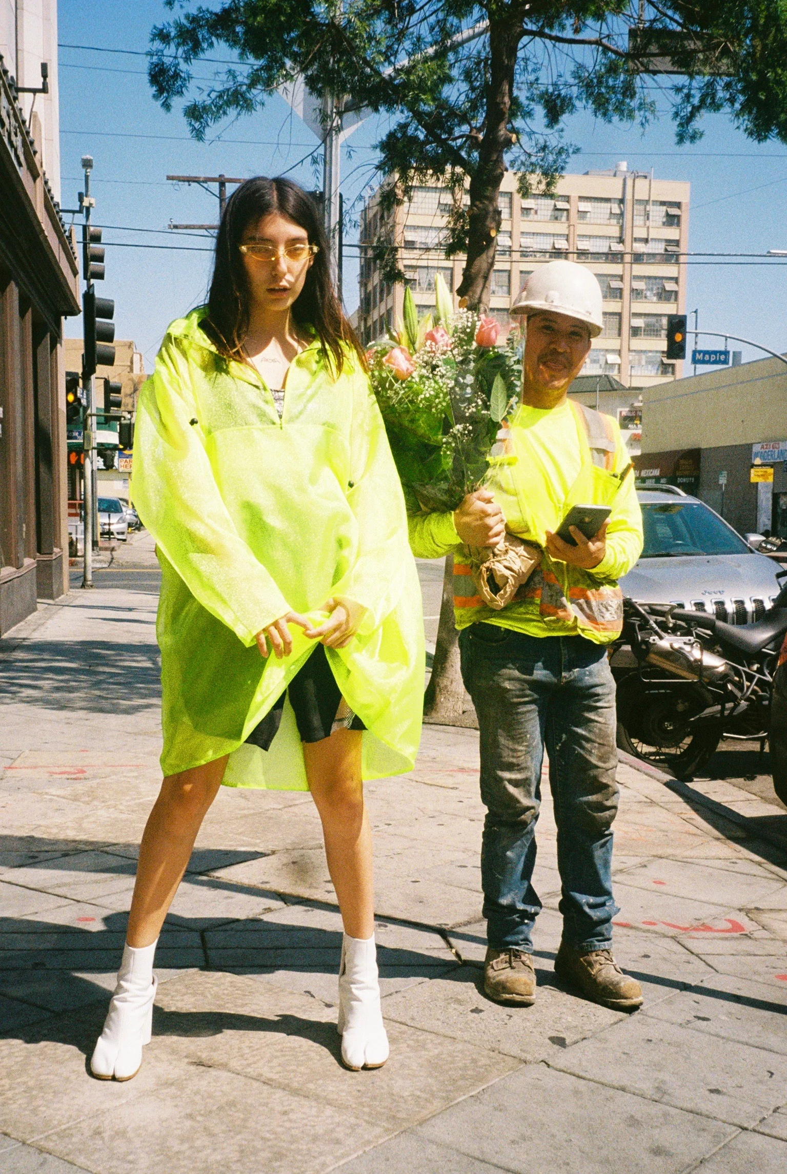 Look 2: Matthew Dolan Denim Jacket Dress, Y/Project Spiral Sandal